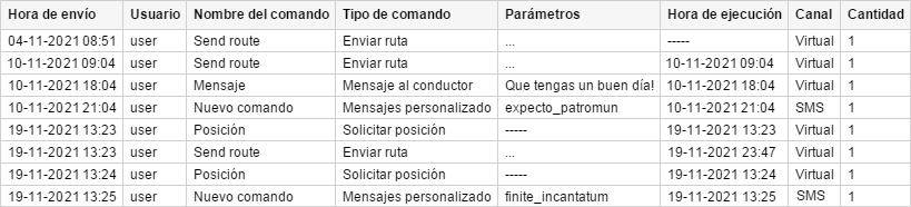 En este informe se muestra la lista de todos los comandos enviados a una unidad en el período indicado. A continuación, se describen las columnas posibles.