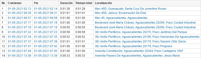 | Localización | La ubicación de la unidad en el momento de una parada. Si no hay información de dirección, en esta columna se ponen rayas. |
