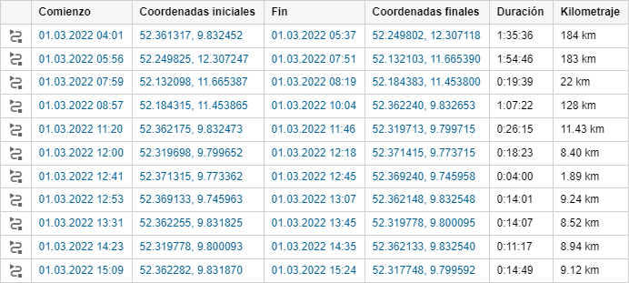 | Duración | La duración del viaje, es decir, el intervalo temporal, durante el cual la unidad estaba en movimiento. |