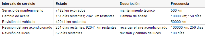 | Frecuencia | El intervalo (kilometraje, horas de motor, días) después del cual habrá que pasar el servicio técnico planeado. |