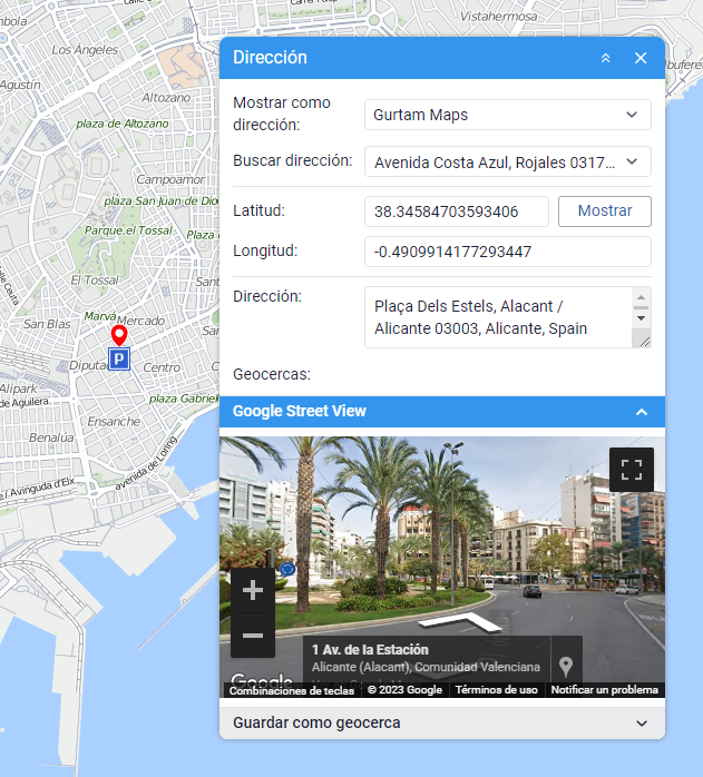 Si hace clic en los marcadores de paradas o estacionamientos, se pueden mostrar imágenes panorámicas de la localidad. Para esto, en los parámetros del usuario hay que elegir los mapas con esta función disponible (por ejemplo, Google Street View o Yandex Panorama). Si hay imágenes de la localidad con las coordenadas del marcador, el aspecto del cursor con que se lo apunta cambia de la flecha por la mano. Un clic en el marcador abre la foto panorámica en la ventana de la herramienta Dirección. Un doble clic en otro marcador así refresca la información.