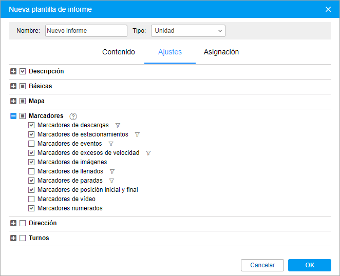) para los marcadores de llenados y descargas de combustible, paradas y estacionamientos, exceso de velocidad y eventos. Los parámetros de filtración indicados en esta sección de ajustes se aplican a los marcadores en el mapa y en las gráficas.