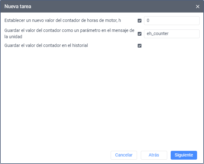 Establecer un nuevo valor del contador de horas de motor | Permite reiniciar el contador de horas de motor (es decir, indicar valor 0) o indicar cualquier otro valor para él. Para esto, active la opción e ingrese un nuevo valor en horas que quiere establecer cuando se ejecute la tarea. |