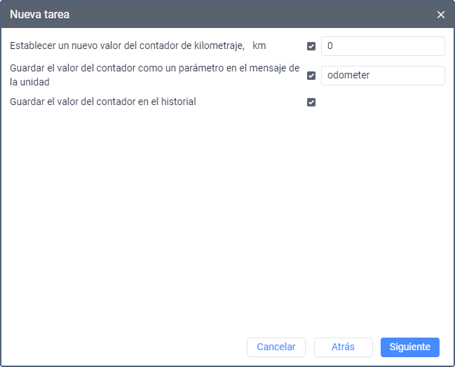 | Establecer un nuevo valor del contador de kilometraje | Permite reiniciar el contador de kilometraje (es decir, indicar valor 0) o indicar cualquier otro valor para él. Para esto, active la opción e ingrese un nuevo valor en kilómetros que quiere establecer cuando se ejecute la tarea. |