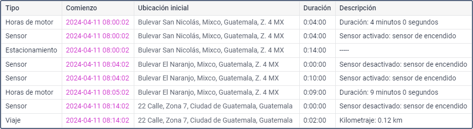 | Duración | La duración del estado. En el caso de llenados de combustible, descargas de combustible y recargas de batería, se muestra 0, ya que la duración de estos no se calcula en el sistema. |