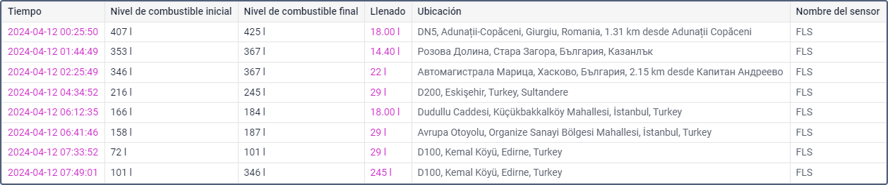 | Llenado | Volumen del combustible llenado (entre paréntesis puede indicarse el nombre del sensor). |
