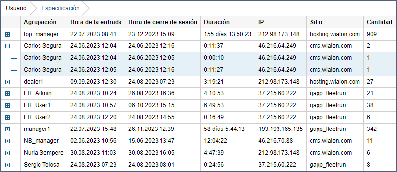 A la tabla Entradas se puede aplicar tales ajustes como agrupación, clasificación, especificación, numeración de líneas, la línea Total, limitaciones de tiempo. Por defecto, los datos en la tabla están agrupados por usuario.