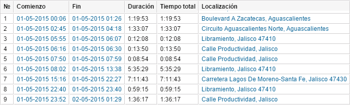 | Ubicación | La ubicación de la unidad durante un estacionamiento. Si se ha determinado un movimiento insignificante, está indicada la ubicación inicial de la unidad. Si la ubicación de la unidad no está disponible en el intervalo de estacionamiento, esta se determina por la ubicación inicial de la unidad en el viaje que sigue al estacionamiento. |
