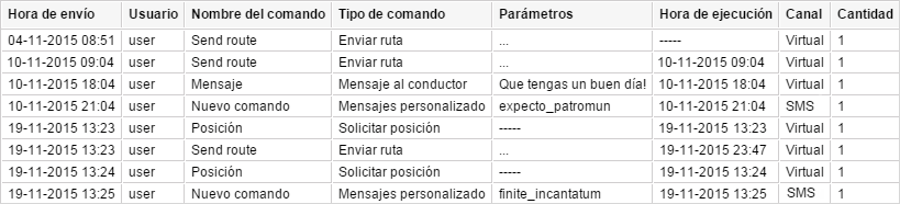 En este informe se muestra la lista de todos los comandos enviados a una unidad en el período indicado. A continuación, se describen las columnas posibles.