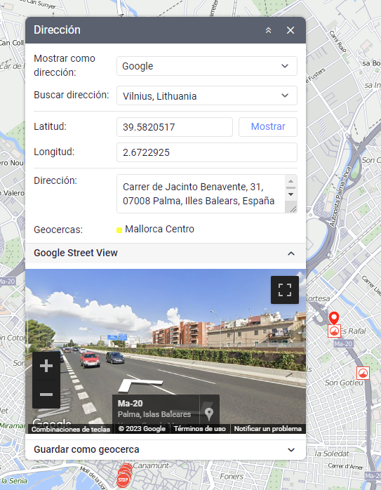 Si hace clic en los marcadores de paradas o estacionamientos, se pueden mostrar imágenes panorámicas de la localidad. Para esto, en los parámetros del usuario hay que elegir los mapas con esta función disponible (por ejemplo, Google Street View). Si hay imágenes de la localidad con las coordenadas del marcador, el aspecto del cursor con que se lo apunta cambia de la flecha por la mano. Un clic en el marcador abre la foto panorámica en la ventana de la herramienta Dirección. Un doble clic en otro marcador así refresca la información.
