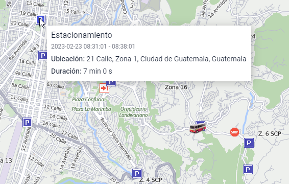 | Parada, estacionamiento | Fecha y hora de inicio y final, duración, ubicación. |