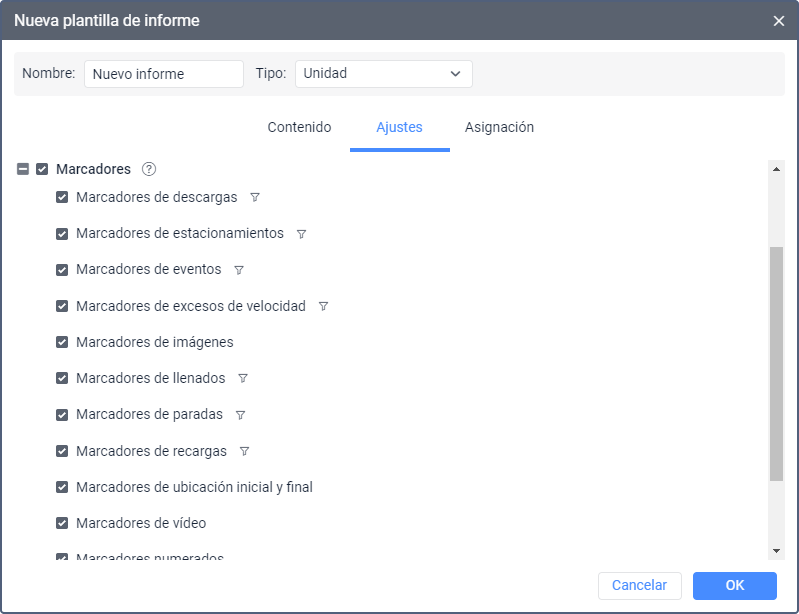 ) para los marcadores de llenados y descargas de combustible, recargas de batería, paradas y estacionamientos, exceso de velocidad y eventos. Los parámetros de filtración indicados en esta sección de ajustes se aplican a los marcadores en el mapa y en las gráficas.