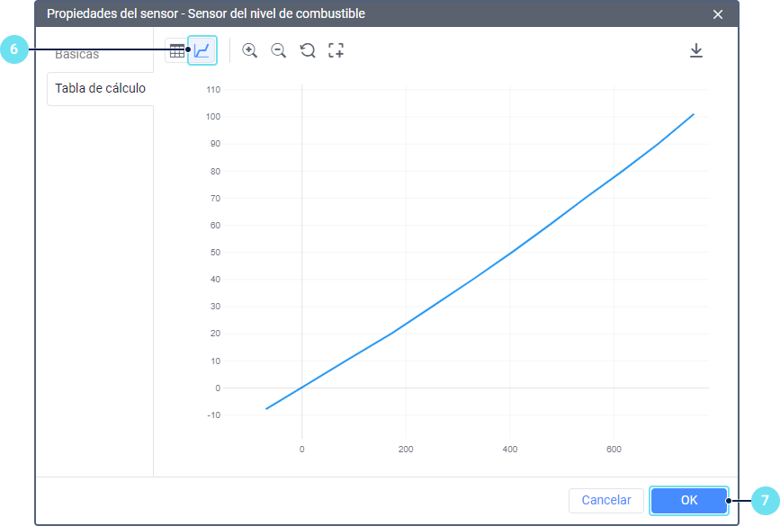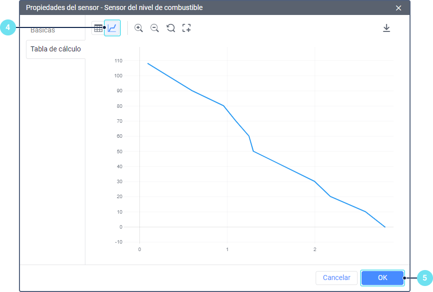 Antes de configurar la tabla de cálculo para el sensor del nivel de combustible, calibre el tanque de combustible para obtener una tabla en la que los valores X corresponden a las lecturas del sensor y los valores Y, a los volúmenes de combustible.