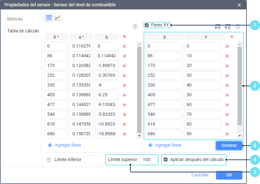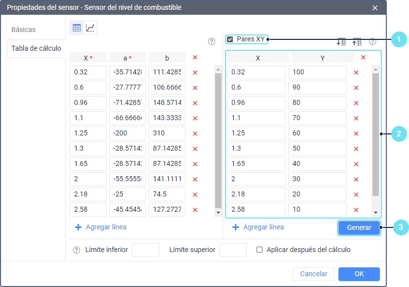 Active la herramienta Pares XY en la pestaña Tabla de cálculo de las propiedades del sensor del nivel de combustible.