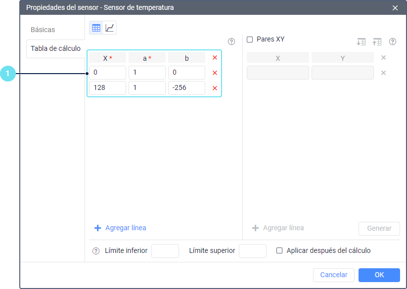 En la pestaña Tabla de cálculo de las propiedades del sensor de temperatura, agregue dos líneas y especifique los valores necesarios de la siguiente manera: