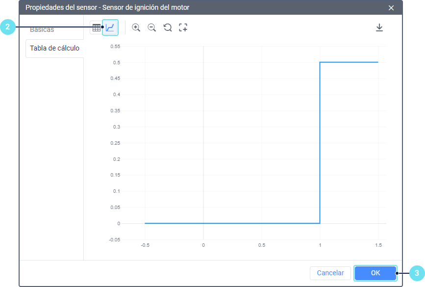 Tomemos un ejemplo de rellenar la tabla de cálculo para el sensor de ignición no digital cuando la activación de la ignición se determina por el parámetro que envía voltaje. Por ejemplo, cuando el voltaje es inferior a 0,5 V, la ignición está encendida, cuando el voltaje es mayor que 0,5 V, está apagada.