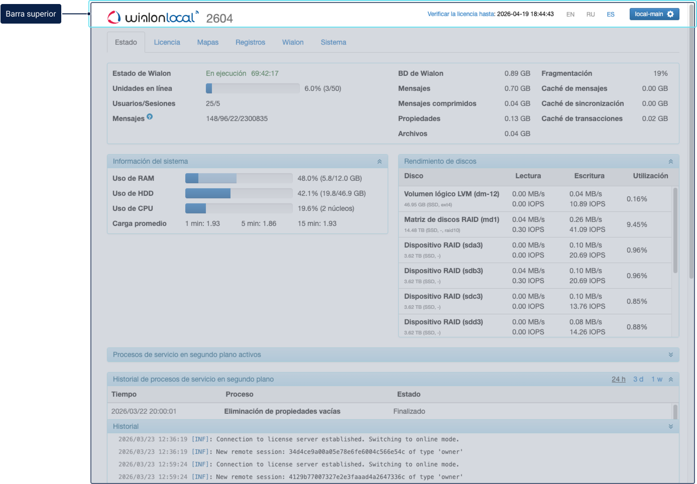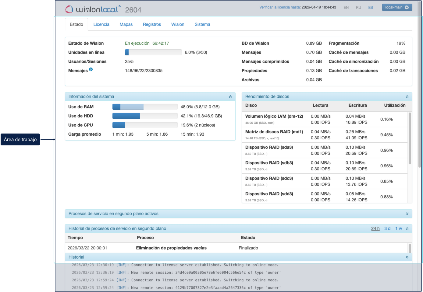 El historial se encuentra en la parte inferior de la pantalla. Muestra información sobre los eventos actuales que ocurren en el sistema. Por ejemplo, sobre el inicio y la detención de Wialon, la disponibilidad de nuevas actualizaciones, la instalación de componentes, etc. Cuando se recarga la página, todos los eventos se eliminan del registro.