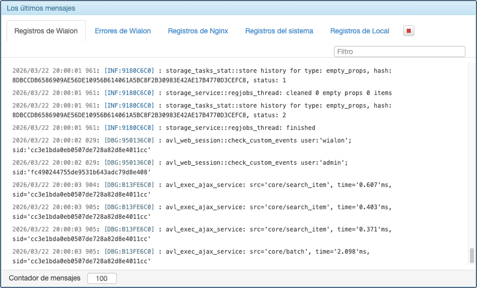 En esta pestaña puede consultar diferentes tipos de registros que se mantienen en el sistema. Están disponibles los últimos cien mensajes de (entre paréntesis se indica su ubicación física en el servidor):