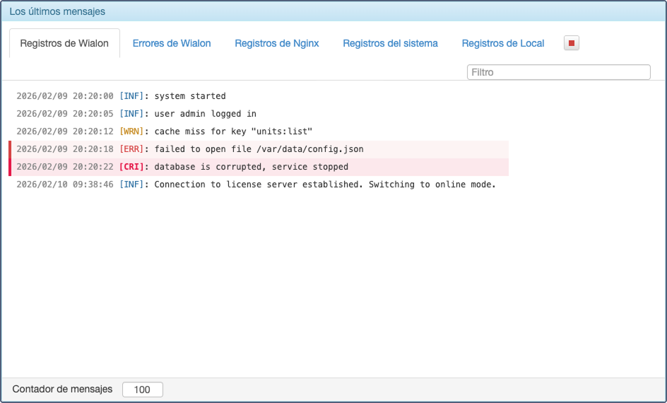 También puede ajustar el número de líneas mostradas en el registro. Para ello, ingrese el número necesario en el campo Contador de mensajes situado debajo (equivale a la utilidad tail).