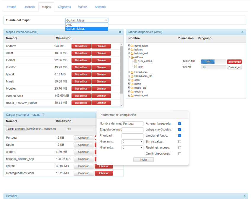 Si tiene sus propios mapas, puede cargarlos e instalarlos en su servidor. Si el mapa cargado está en formato AVD, se coloca en la sección Mapas instalados inmediatamente. Si tiene otro tipo de mapa fuente, necesita compilación después de cargarlo. Haga clic en el botón Compilar, ajuste los parámetros de compilación y haga clic en Iniciar.