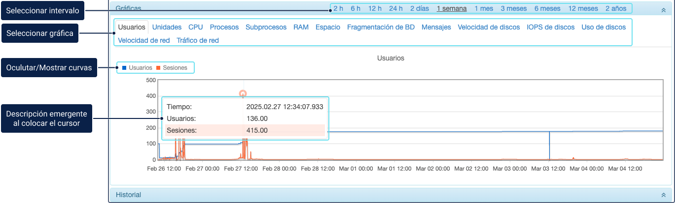 La sección Gráficas muestra información visual sobre varias características. El intervalo de tiempo se selecciona en la parte superior derecha de la sección.