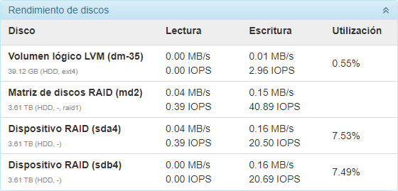 La sección Rendimiento de discos muestra los datos sobre la intensidad de lectura, escritura y la carga de los discos duros donde se encuentra la base de datos de Wialon Local.