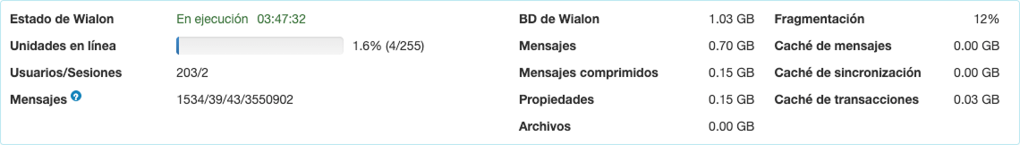 | Mensajes comprimidos | Tamaño total de los mensajes comprimidos en la base de datos de Wialon. |