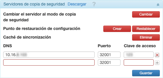 | DNS, Puerto, Clave de acceso | En estos campos debe especificar el DNS, puerto y clave de acceso para cada servidor de copia de seguridad. Estos parámetros se comparan con los especificados en el archivo config.txt del servidor de copia de seguridad. |