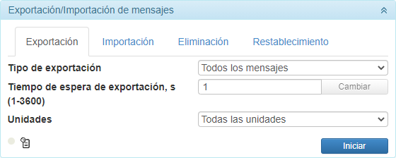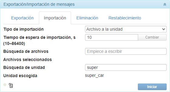 Al igual que en la exportación, puede especificar la duración de la pausa entre la importación de mensajes de diferentes unidades en el campo Tiempo de espera de importación.