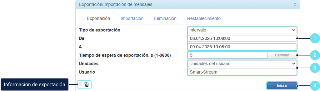 aparece información sobre la exportación: su estado, hora de inicio, cantidad de mensajes y unidades, etc.