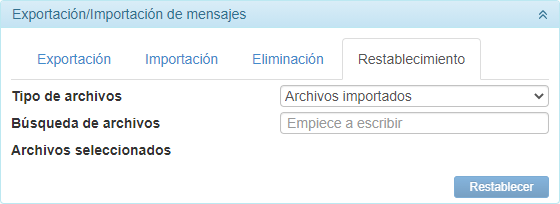 En esta pestaña puede recuperar los archivos importados anteriormente y los archivos cuya importación produjo un error. Como resultado del restablecimiento, los archivos se transfieren de los directorios /home/wialon/wlocal/tmp/exp_imp_dir/imported_files/ y /home/wialon/wlocal/tmp/exp_imp_dir/import_failure al directorio /home/wialon/wlocal/tmp/exp_imp_dir. Después de hacerlo, puede volver a importar estos archivos.