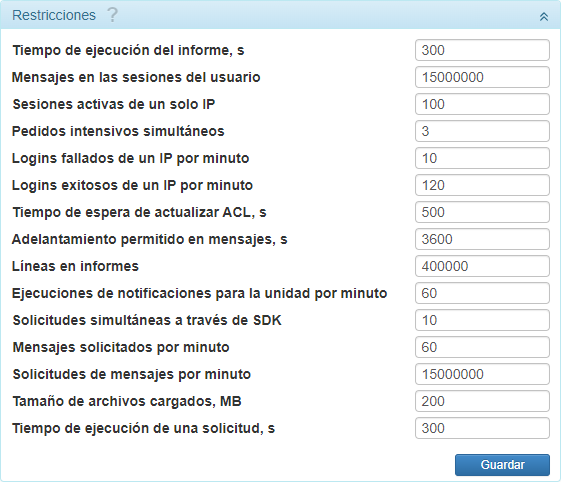 | Tiempo de espera de actualizar ACL, s | El intervalo de recalcular los derechos de acceso de usuarios a sus unidades. Cuanto menor el intervalo, mayor la carga en el servidor. | 500 |