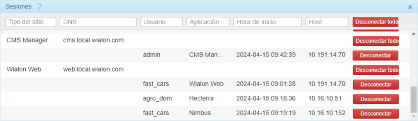 En esta sección puede ver las sesiones de usuarios activas en todos los sitios.