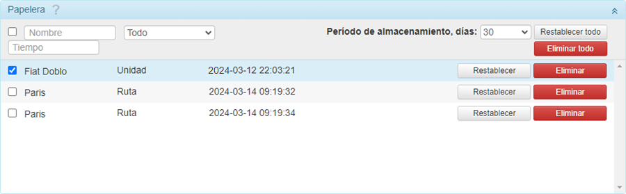 Los objetos eliminados del sistema se envían a la papelera. Si es necesario, puede restablecerlos. Puede seleccionar el período de almacenamiento de objetos eliminados en la lista desplegable del encabezado de la papelera (30 días por defecto).