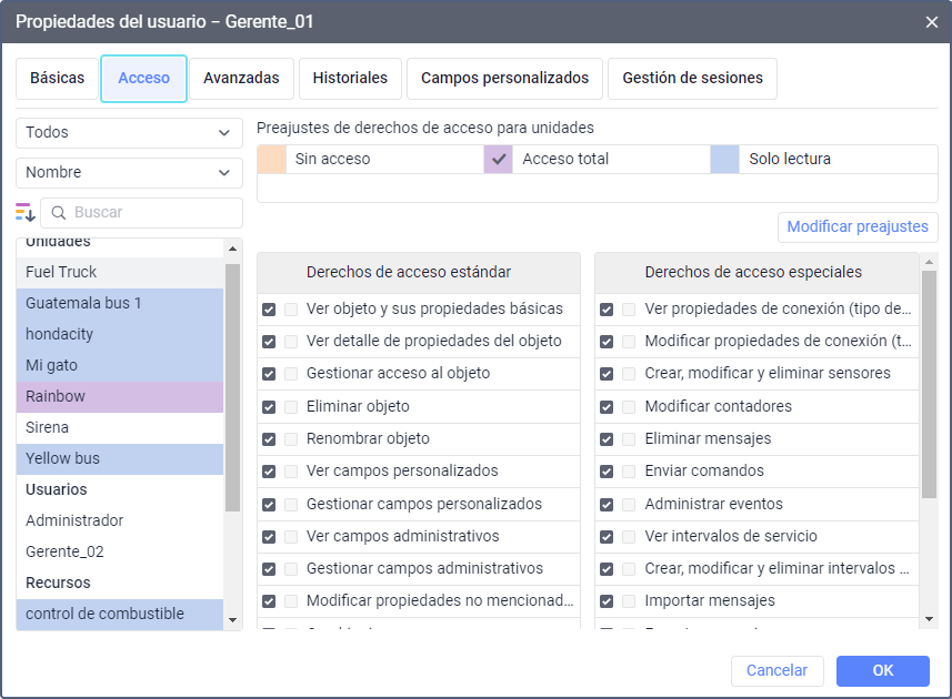 Los derechos especiales son derechos de acceso característicos solo para un tipo determinado de macroobjetos. Por ejemplo, para una unidad se puede establecer el derecho de acceso especial Crear, modificar y eliminar intervalos de servicio; para un usuario, Actuar en nombre del usuario; para un recurso, Crear, modificar y eliminar geocercas, etc.