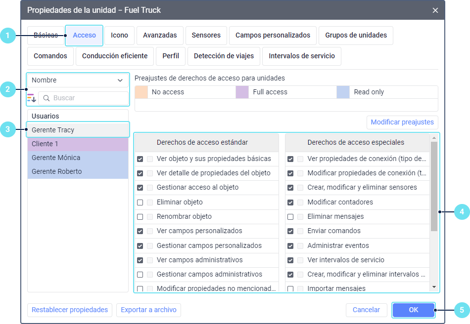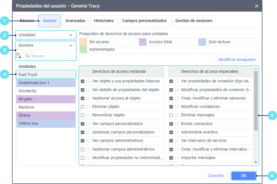 Se puede conceder un derecho de acceso a la unidad, grupo de unidades o recurso (cuenta) tanto en las propiedades de este objeto, como en las propiedades del usuario que debe obtener el acceso. Los derechos de acceso a usuarios y rutas se conceden solo en las propiedades del usuario que debe obtener estos derechos de acceso. A continuación se describen ambos métodos, así como particularidades de este proceso.