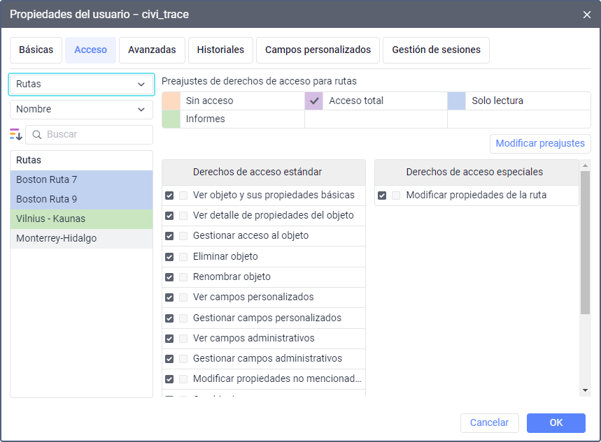Los derechos de acceso a una ruta permiten al usuario verla en el mapa y en la lista de trabajo de la pestaña Rutas, cambiar sus puntos de control, crear horarios y rutinas para ella y realizar otras operaciones.