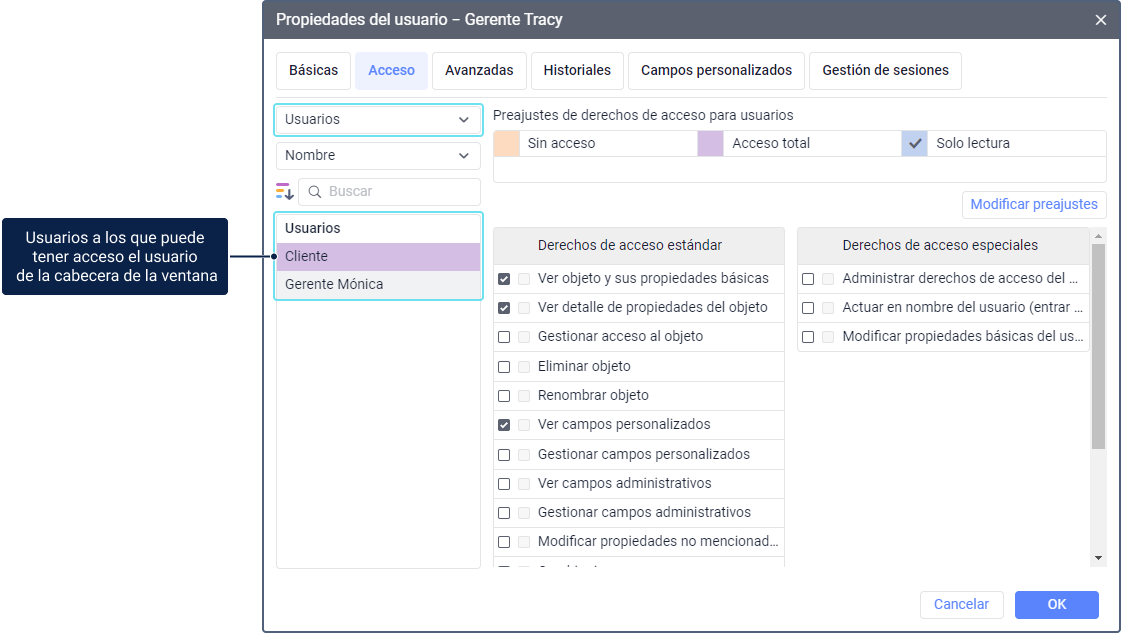 En las propiedades del usuario en la pestaña Acceso, se puede indicar qué derechos debe tener este usuario a otros usuarios. Para hacerlo, seleccione en el filtro el elemento Usuarios y marque los derechos de acceso necesario a cada usuario de la lista izquierda. Lea más sobre concesión de derechos de acceso aquí.