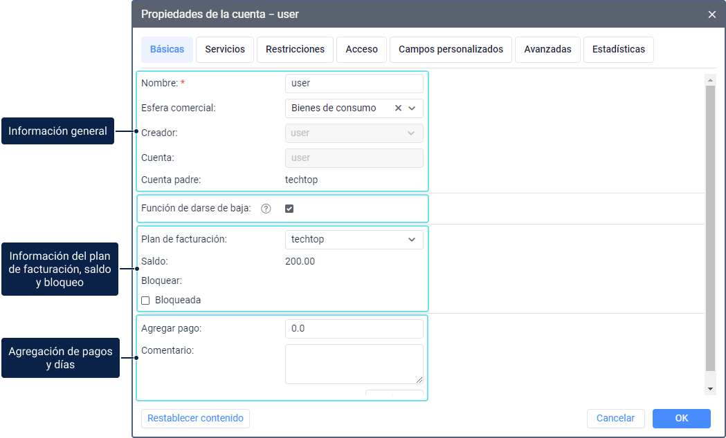 Esta sección de la pestaña Básicas contiene la siguiente información sobre la cuenta:
