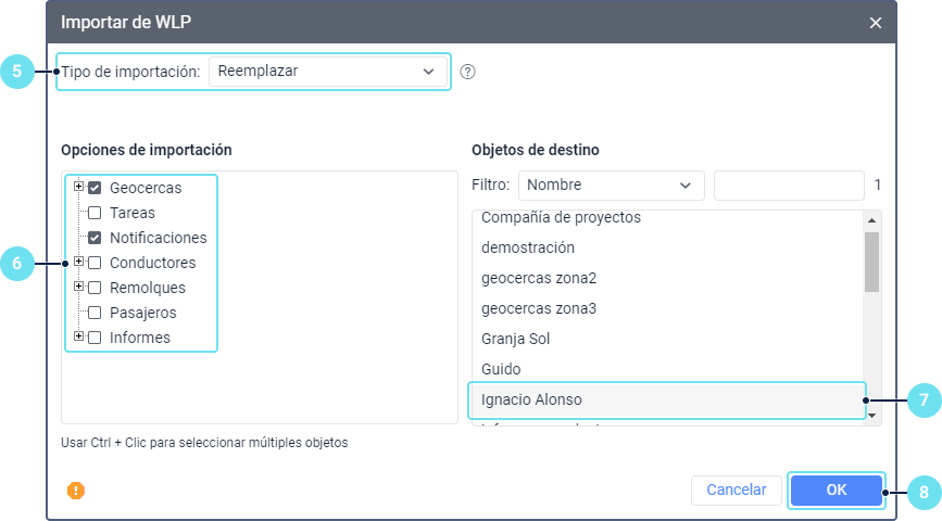 En la ventana Importar de WLP que se ha abierto, seleccione el tipo de importación. Al restablecer el contenido, se aplica el mismo mecanismo que en la importación del archivo WLP.