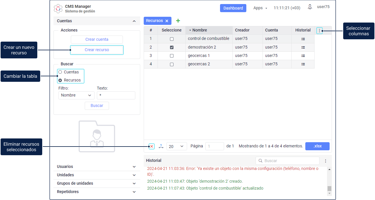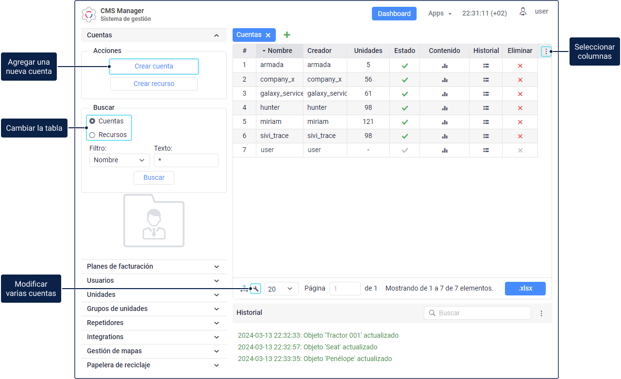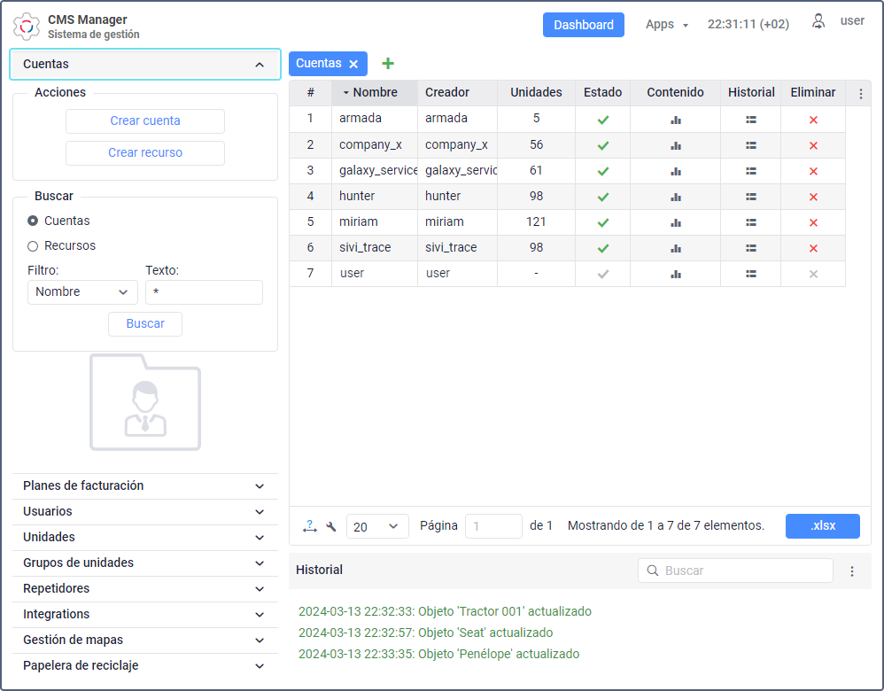 Puede gestionar cuentas y recursos solo en el sistema de gestión CMS Manager. Para ello, abra la sección Cuentas en la barra de navegación.