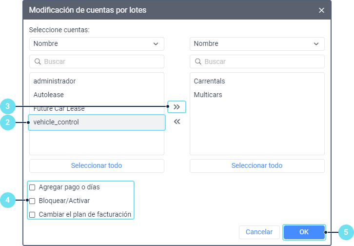 - Cambiar el plan de facturación: permite asignar un otro plan de facturación a las cuentas.