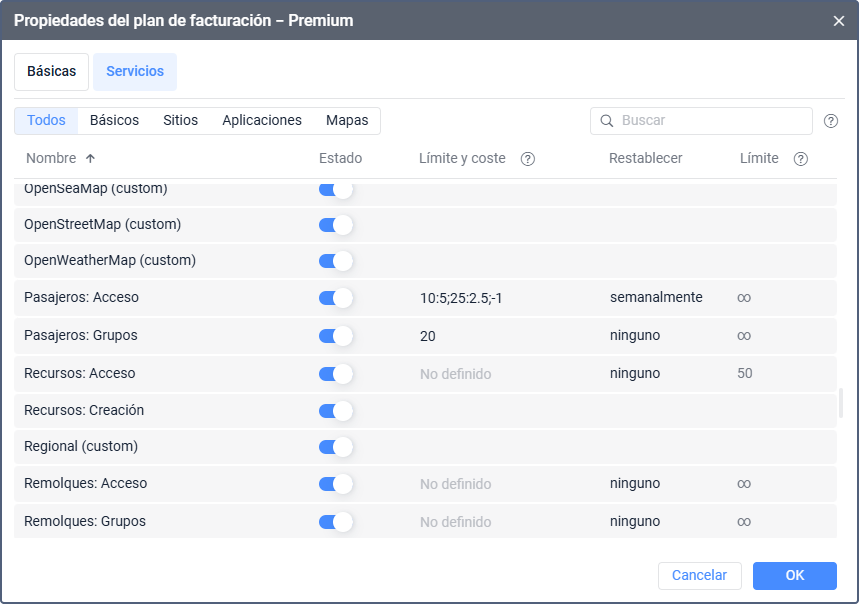 El grupo contiene todos los servicios disponibles. Aquí puede activar o desactivar el servicio, configurar el ajuste de Límite y coste y seleccionar el período de reinicio. Consulte la descripción de servicios para obtener más detalles sobre cada servicio.