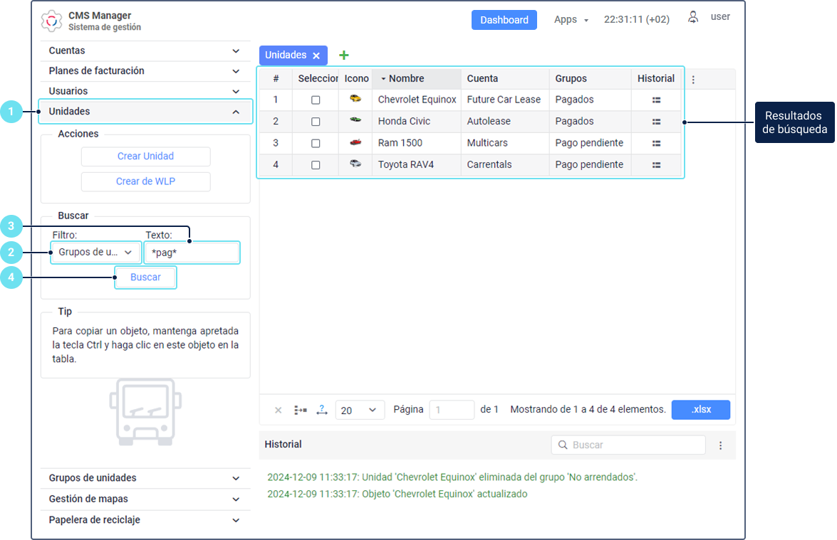 | Activadas | Búsqueda entre las unidades activadas (por su nombre). Deje el campo Texto vacío para ver todas las unidades activadas. | |