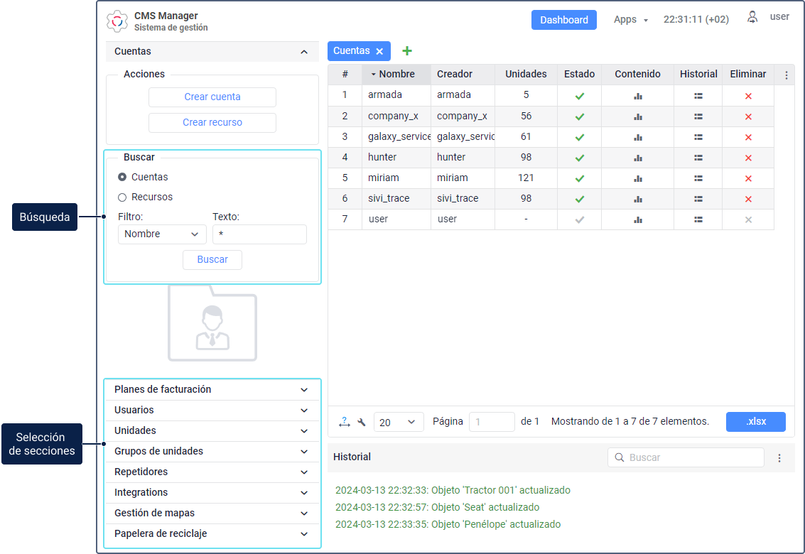 | Acciones | En este bloque se encuentran los botones para crear objetos del sistema (cuentas, usuarios, unidades, etc.). Para la sección Usuarios, aquí también está disponible el botón Gestión de noticias. |