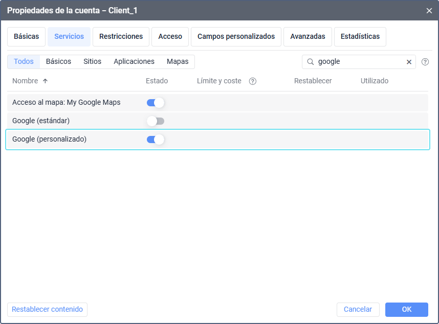 Para los mapas de Google, active adicionalmente Google (personalizado). En caso de otros mapas, active el servicio con el nombre de la fuente de mapa y la marca custom entre paréntesis, por ejemplo, Bing (custom).
