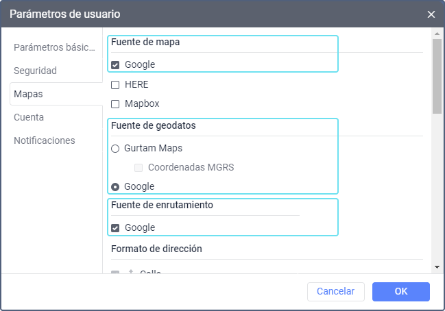 En los ajustes de usuario del sistema de rastreo, seleccione el mapa añadido. Dependiendo de los tipos de servicios seleccionados en el paso 6, puede estar disponible en las secciones Fuente de mapas, Fuente de geodatos, Fuente de rutas.