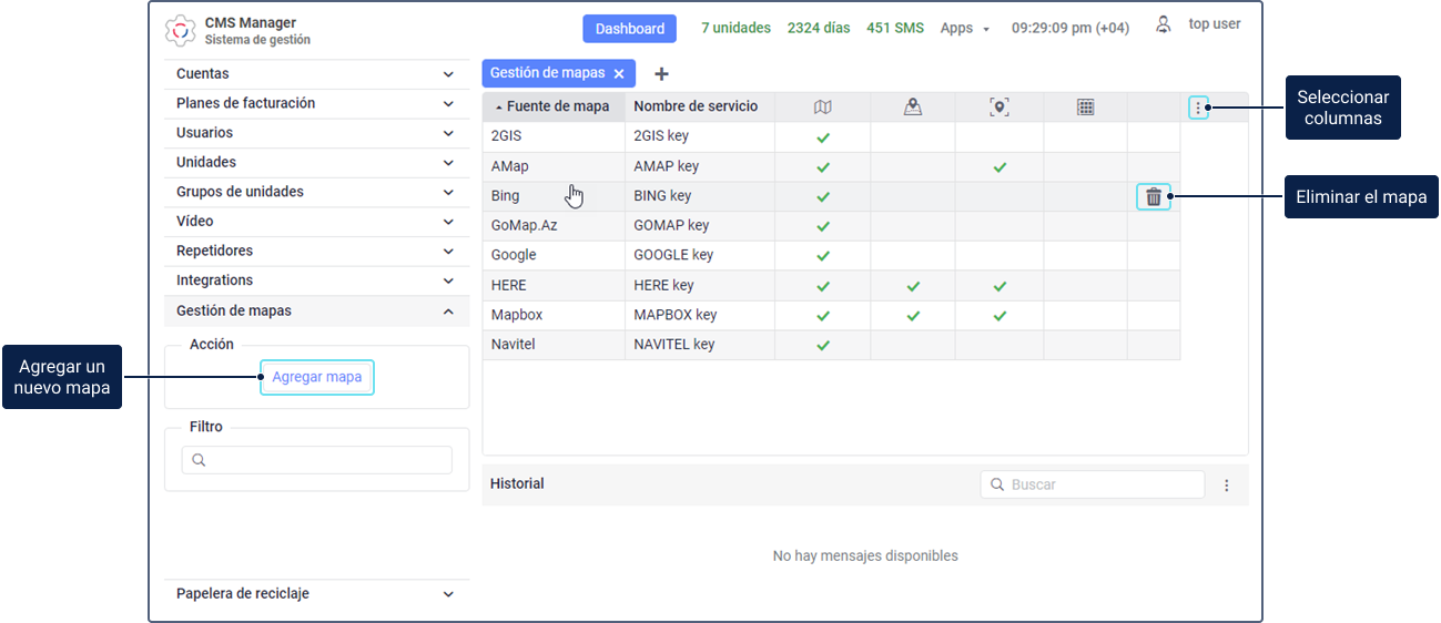 La sección Gestión de mapas está disponible solo en el sistema de gestión CMS Manager para cuentas de nivel superior. En esta sección, puede añadir, modificar y eliminar mapas. La tabla estándar contiene todos los mapas que se pueden utilizar como mapa base, fuente de enrutamiento, fuente de geodatos y de matriz de distancias. En la línea de cada mapa, los servicios disponibles para él están indicados con el icono