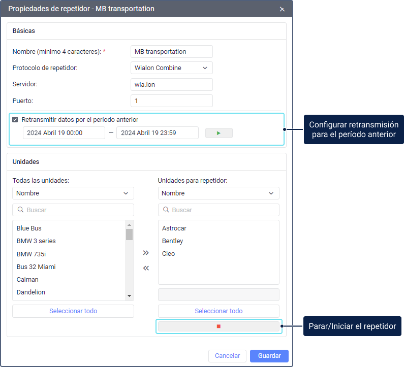 Los mensajes de unidades se transmiten solo si el repetidor está iniciado. Por defecto, la transmisión se realiza en tiempo real. Si se ha suspendido, los mensajes acumulados durante este tiempo no se transmiten. Para transmitirlos, utilice la opción Retransmitir datos por el período anterior.