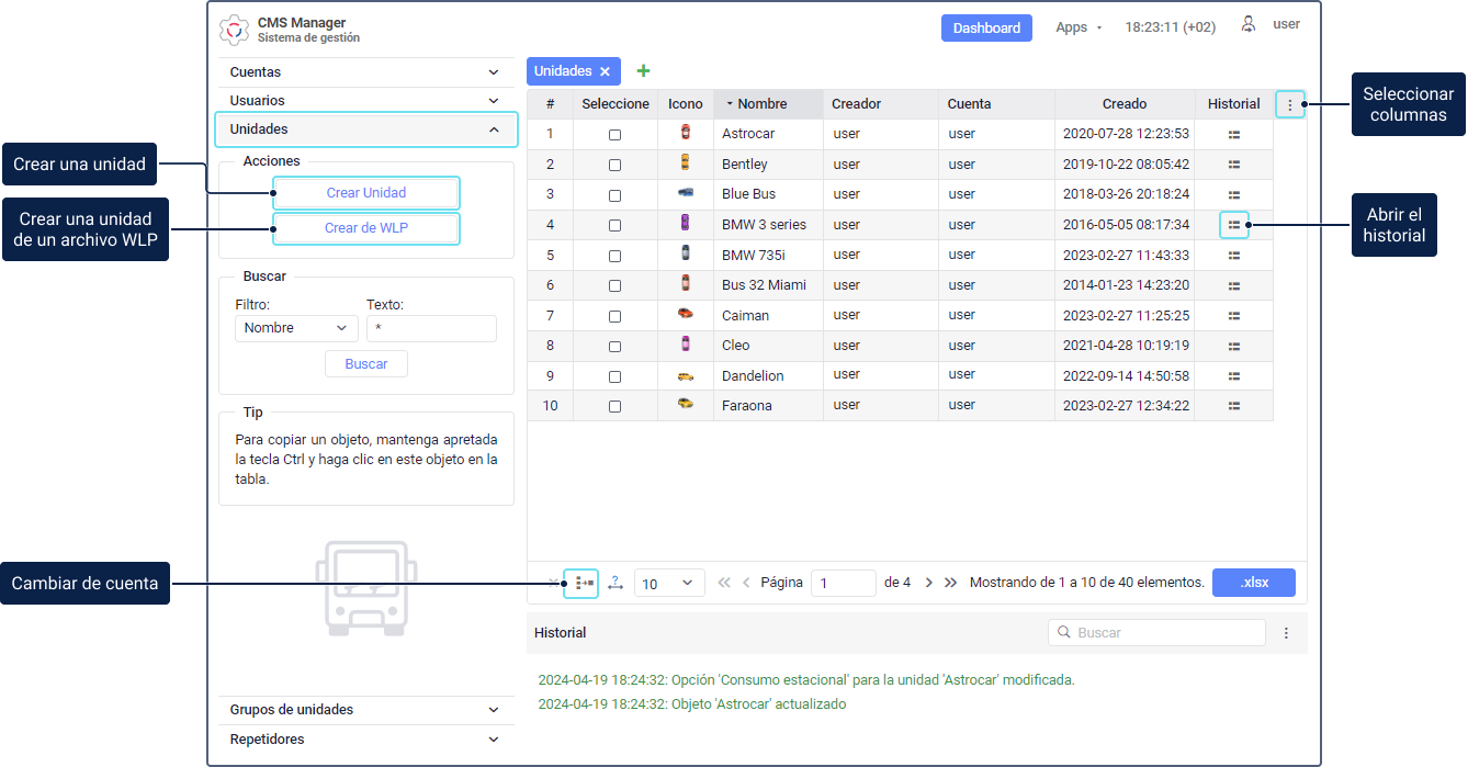 Se puede trabajar con las unidades en el sistema de rastreo satelital (pestaña Unidades) y en el sistema de gestión (sección Unidades).